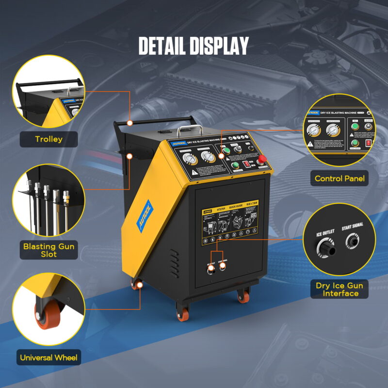 INTELLIGENTE ARBEITSÜBERWACHUNGDie AUTOOL HTS709 steht nicht nur für Kraft, sondern vor allem für Präzision. Dank des integrierten Mikrocomputer-Steuerungssystems hat der Bediener vollen Einblick in die Parameter des Geräts: Dual Display Manometer: Das System aus zwei Manometern ermöglicht die gleichzeitige Überwachung des Kompressordrucks und des tatsächlichen Arbeitsdrucks der Pistole. Dies ist entscheidend bei der Reinigung empfindlicher Dichtungen oder Elektronik. Stufenlose Auswurfregulierung: Mit dem speziellen "Adjustment"-Drehknopf können Sie die Menge des zugeführten Granulats im Bereich von 0 bis 3,2 kg pro Minute regulieren. Dies ermöglicht maximale Trockeneiseinsparungen bei leichten Verschmutzungen. LED-Statusanzeigen: Signalisieren die Betriebsbereitschaft des Geräts und die korrekte Stromversorgung des Spraysystems. |
