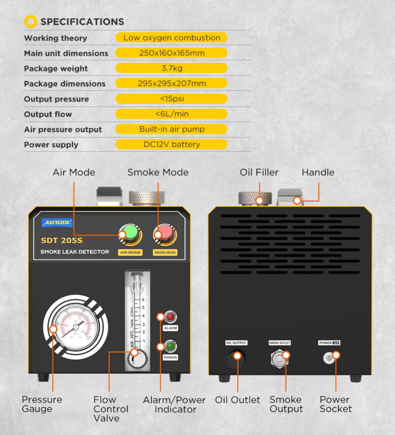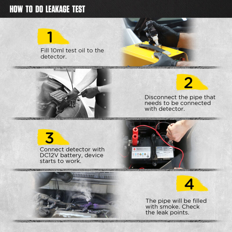 VIELSEITIGE SYSTEMDIAGNOSEDas Gerät erzeugt Rauch unter optimalem Druck (bis zu 15 PSI / ca. 1 bar), was eine sichere Prüfung der meisten Systeme in PKWs, Lieferwagen und Motorrädern ermöglicht. Hauptprüfbereiche: